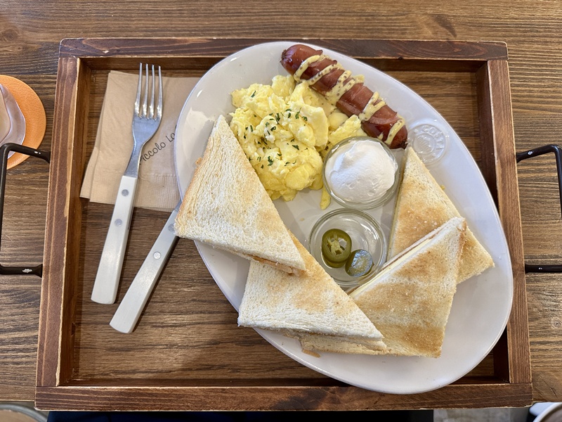 빵 네조각, 할라피뇨, 생크림과 스크램블 에그, 소시지 하나로 구성되어 있습니다.