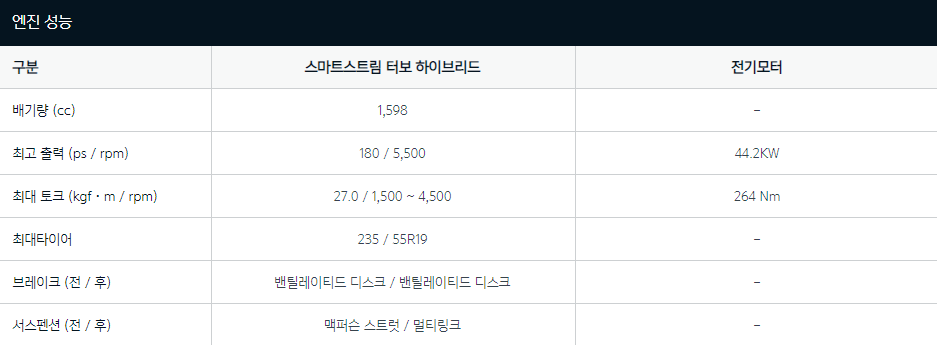 그전에 먼저 쏘렌토 하이브리드의 엔진 사양에 대해 잠시 소개해 드리겠습니다.