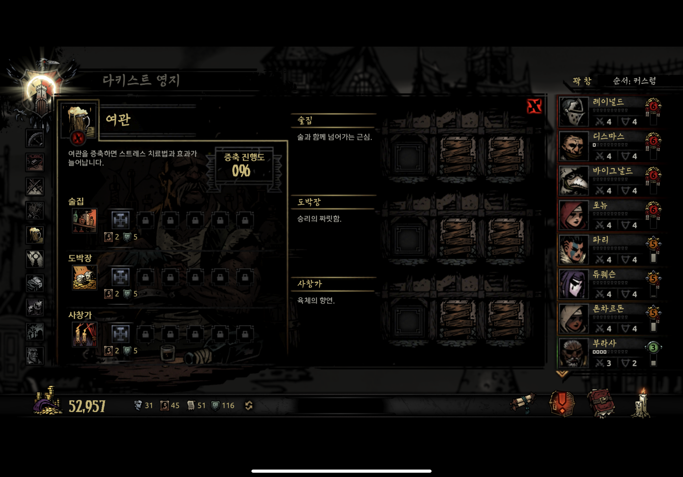 그리고 증축된 건물들은 더 향상된 복지(좋은 무기, 스트레스 해소 효과 증가 등)를 제공하여 영웅들이 더 깊은 던전으로 들어가 죽음을 앞당겨주는 역할을 하게 됩니다.