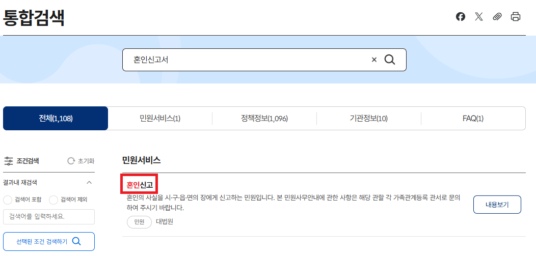 검색창에 혼인신고서 검색해 주세요.