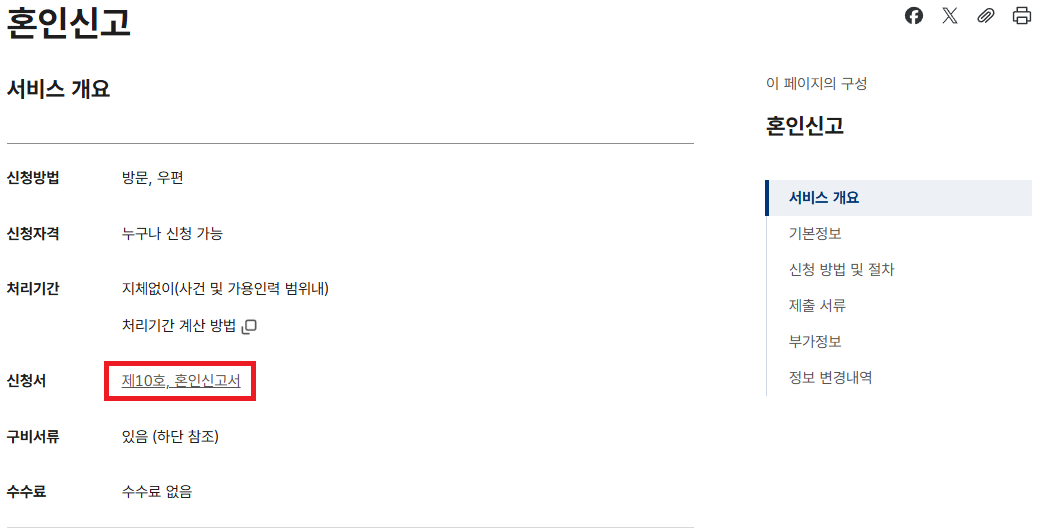 신청서 옆 제10호, 혼인신고서 클릭하시면 한글 파일로 다운로드가 가능합니다.
