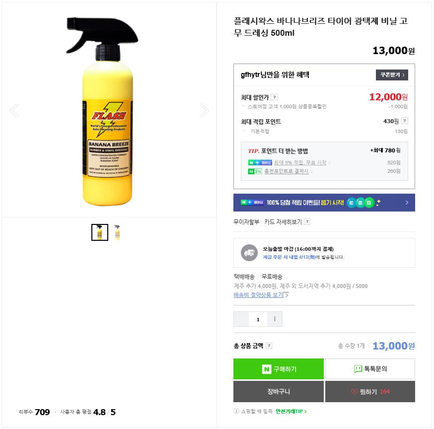 타이어에 광을 내주고 보호해 주는 플래시 왁스의 바나나브리즈입니다.