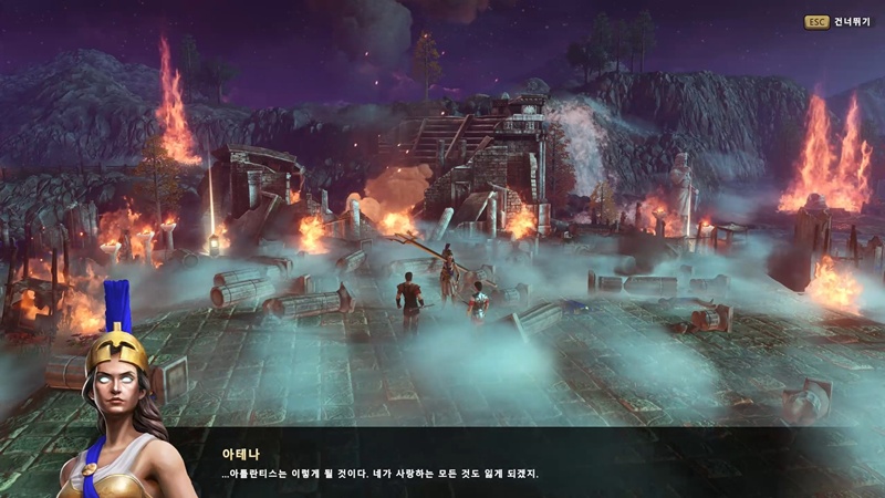 다시 등장한 아테나 여신은 아르칸토스가 실패하면 방금 부숴버린 도시가 아틀란티스의 미래가 될 거라고 경고합니다.