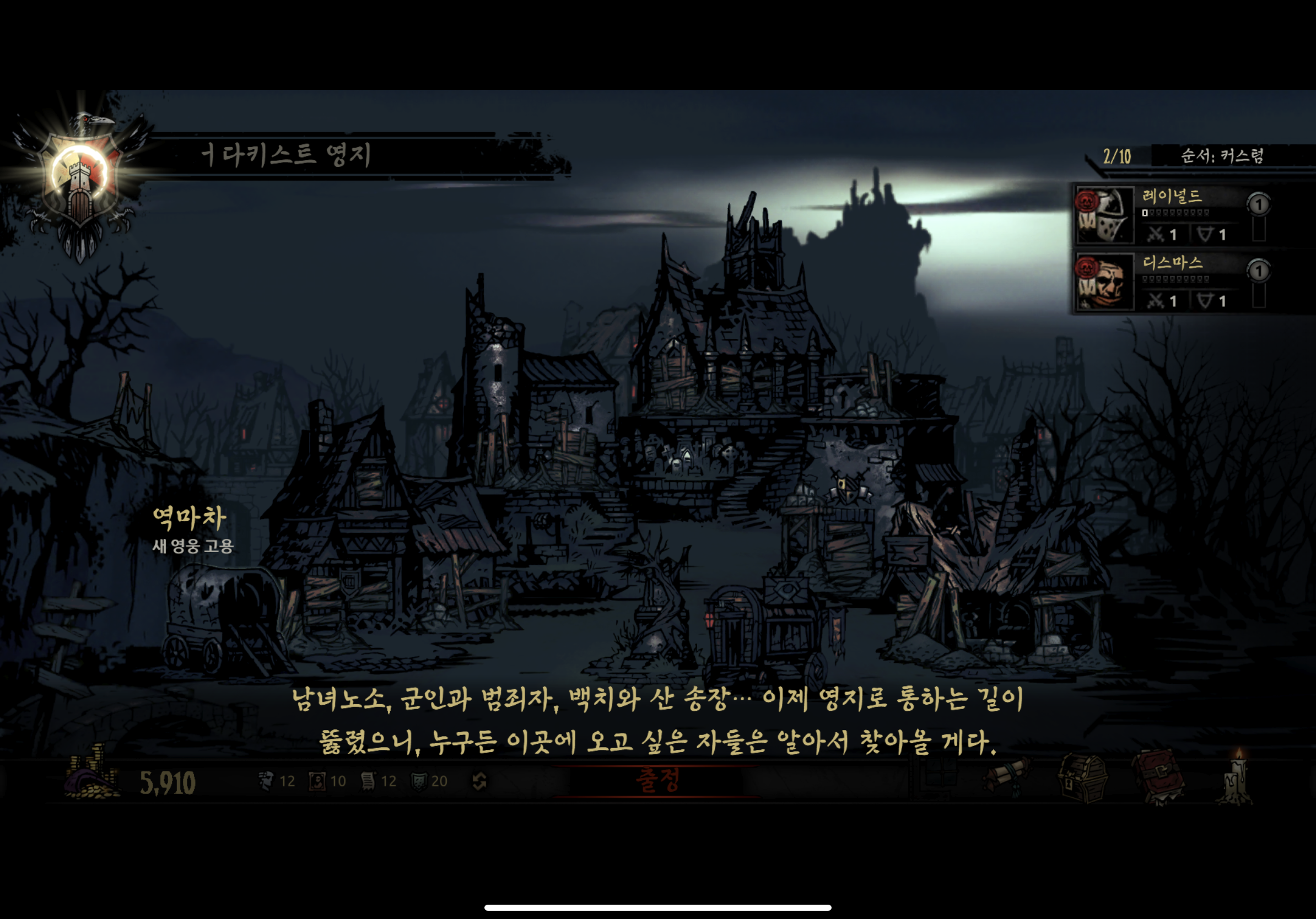 우선 게임을 시작하면 역마차가 영웅들을 태우고 가다 개박살이 나면서 마부는 도망가고 성전사와 노상강도가 덩그러니 남아서 걸어서 영지로 향합니다.