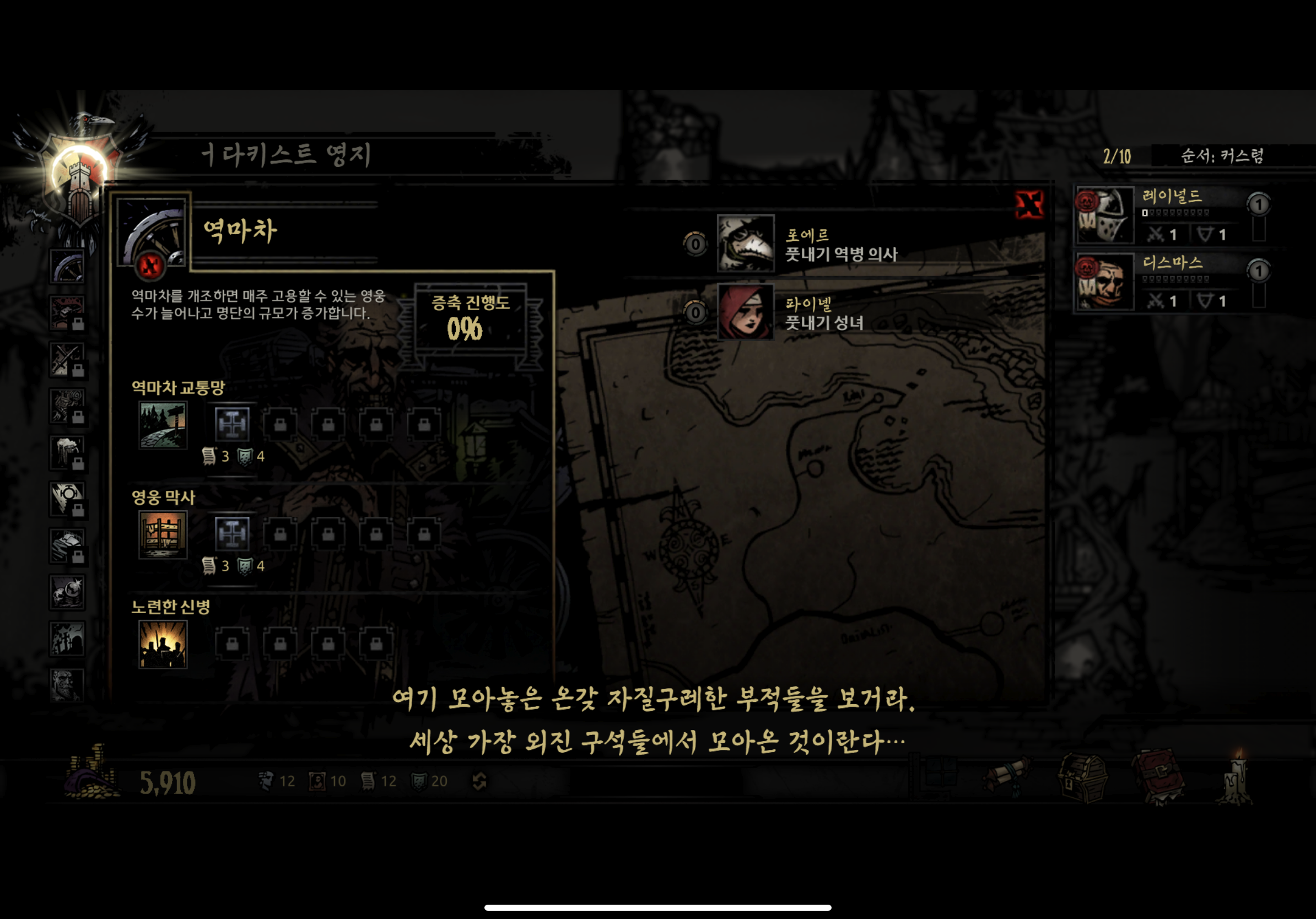 중반부만 가도(역마차 교통량이 어느 정도 레벨업이 되었을 때) 돈이 훨씬 더 중요해진다고 생각하기 때문에 돈을 빨리 모으시려면 영웅들을 던전에 보낼 때 최대한 아무것도 쥐어주지 않은 채로 보내서 일회용으로 계속 쓰는 게 사실 효율적이긴 한대요..