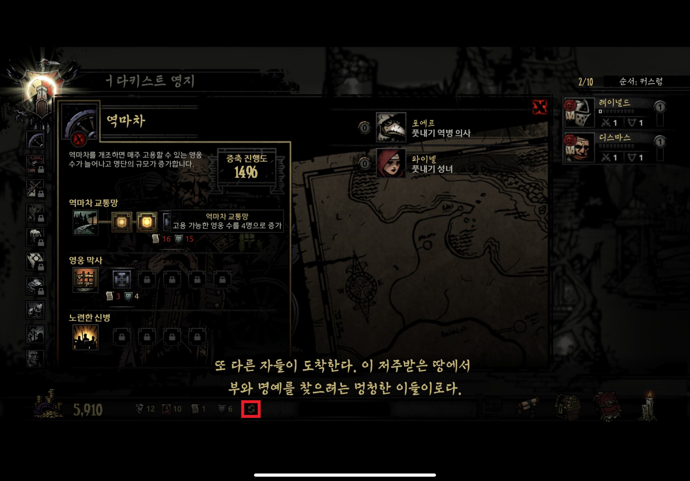 역마차는 매주 영웅들을 영지로 실어오는 역할을 합니다.(던전을 한 번 돌 때마다 1주씩 지나갑니다.)