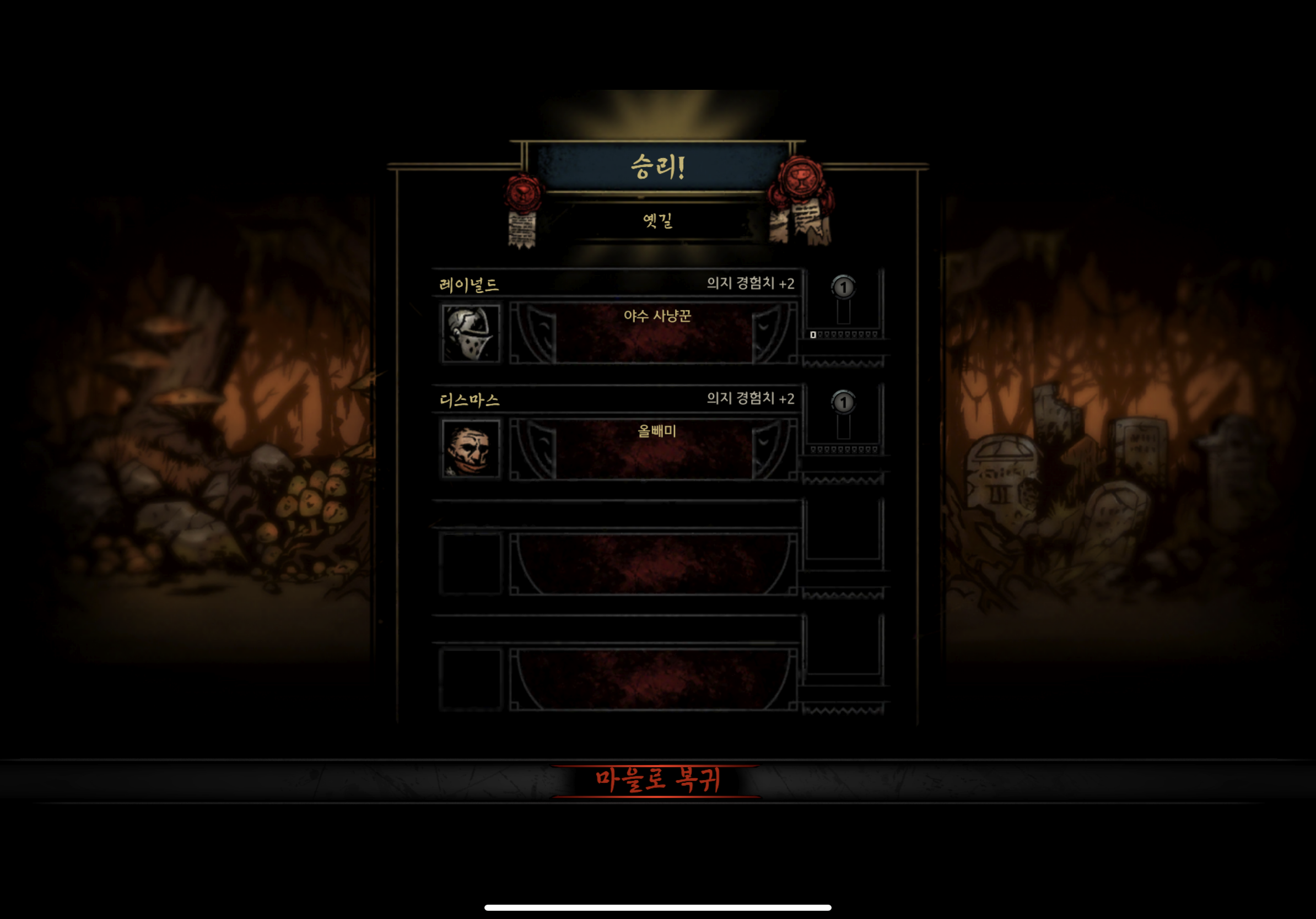 원정이 완료되어 영지로 돌아오게 되면 영웅들에게 던전의 난이도에 따라 의지 경험치가 부여됩니다. 이 경험치가 쌓이면 의지 레벨이 올라가 더 수준 높은 기술과 장비를 착용할 수 있게 되어 고난이도 던전을 들어가실 수 있습니다.