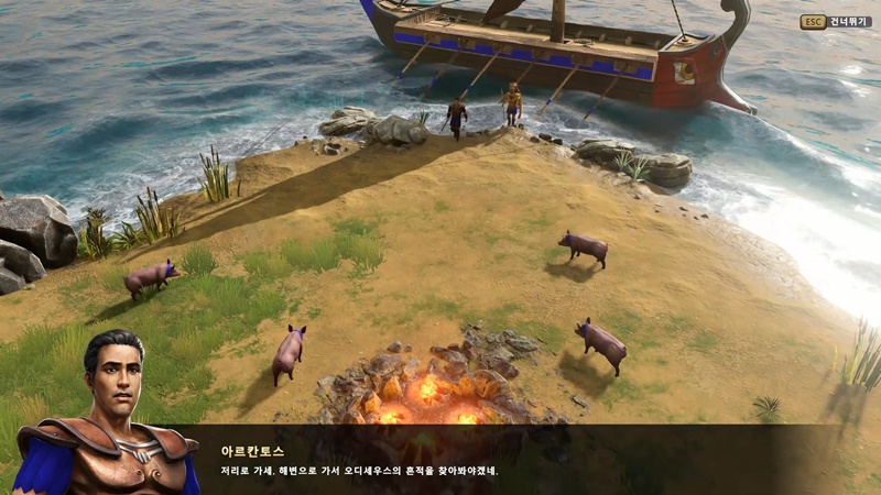 해안가에 상륙한 아르칸토스와 아약스는 돼지들을 발견합니다.