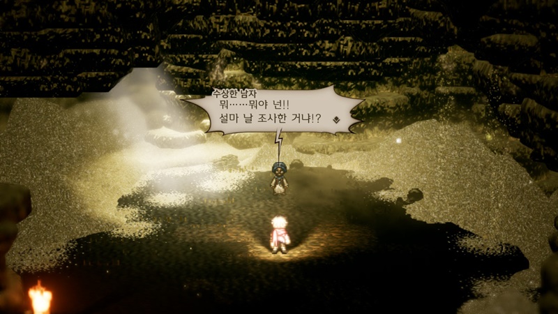 이제 동굴 안으로 들어가 보면 동굴 안에서 수상한 남자를 찾을 수 있습니다.