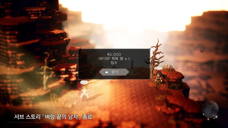 대화를 마치면 보상으로 11,000 리프, HP/SP 회복 잼 1개를 획득합니다.