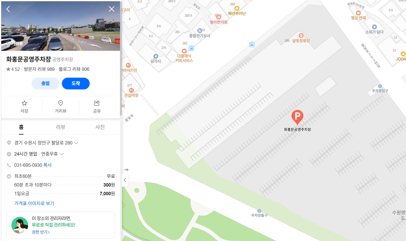 카페 헤올은 화흥문 공영주차장에서 걸어서 5분 정도면 갈 수 있습니다.