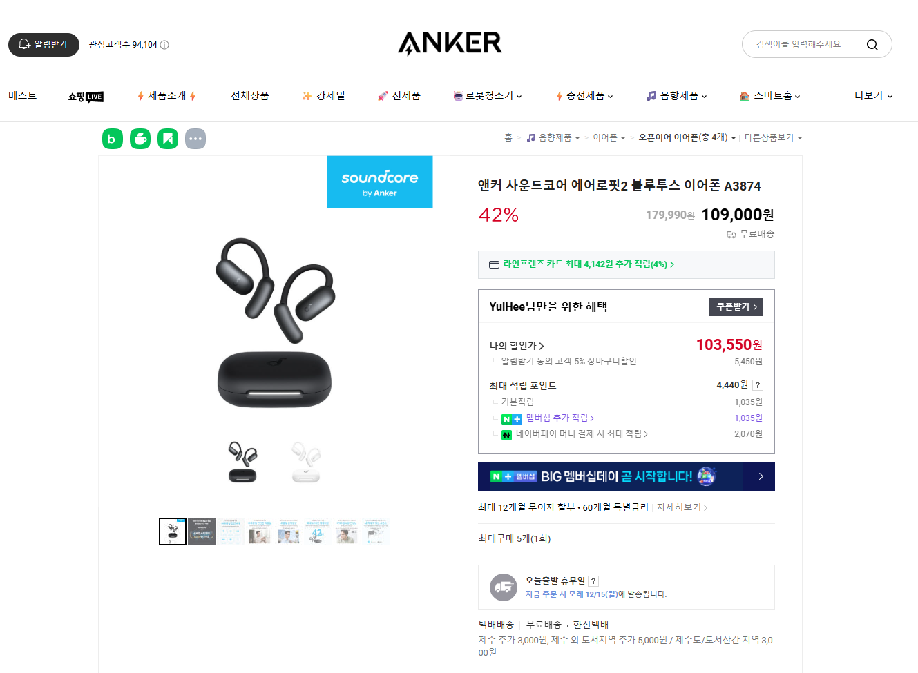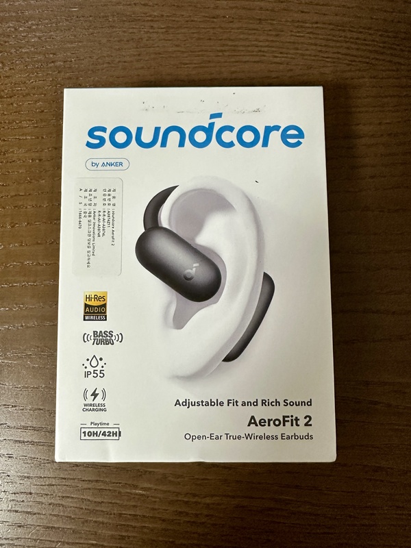 커널형 이어폰만 쓰다가 귓구멍에 땀도 많이 차고, 옆으로 누울 때는 불편하고, 외이도염 같은 거도 많이 걸린다고 해서 구매한 앤커 사운드코어 에어로핏 2입니다.