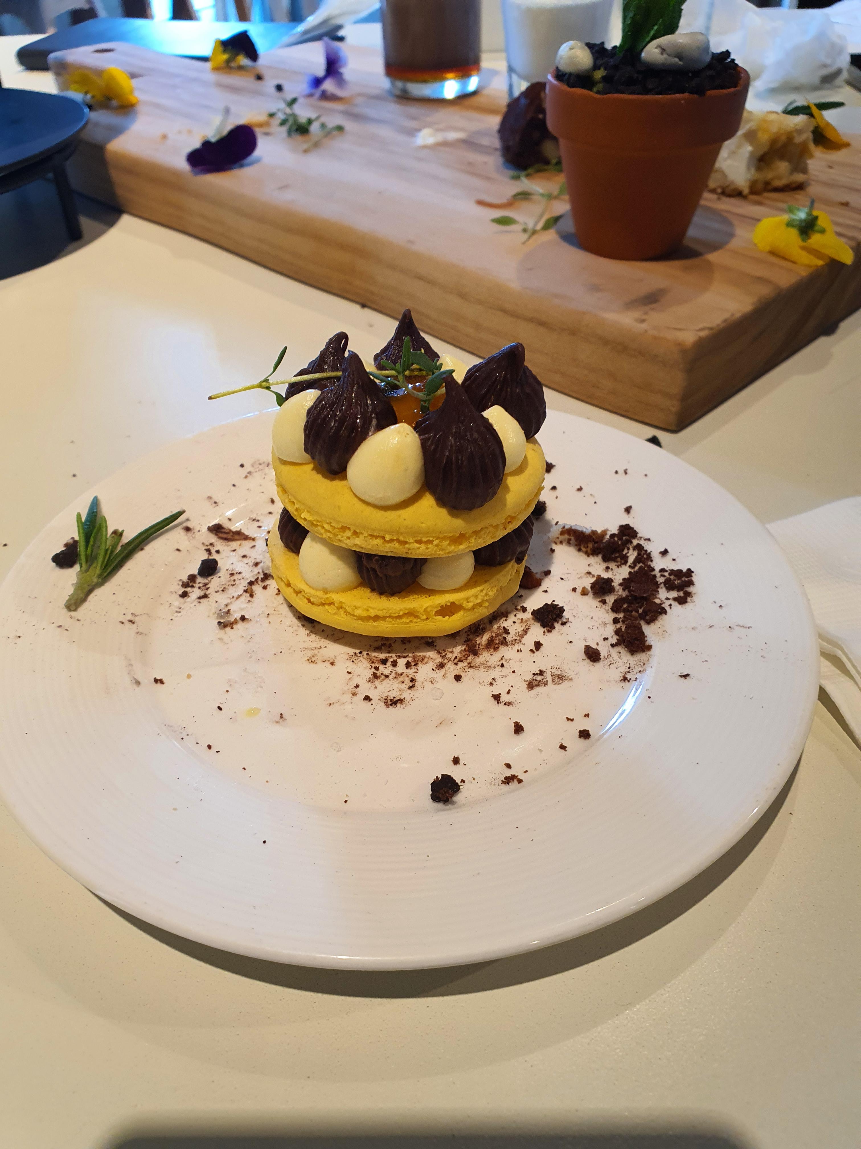 처음에는 마카롱인 줄 알았는데 비스켓 위에 크림이 올려져 있는 디저트입니다.