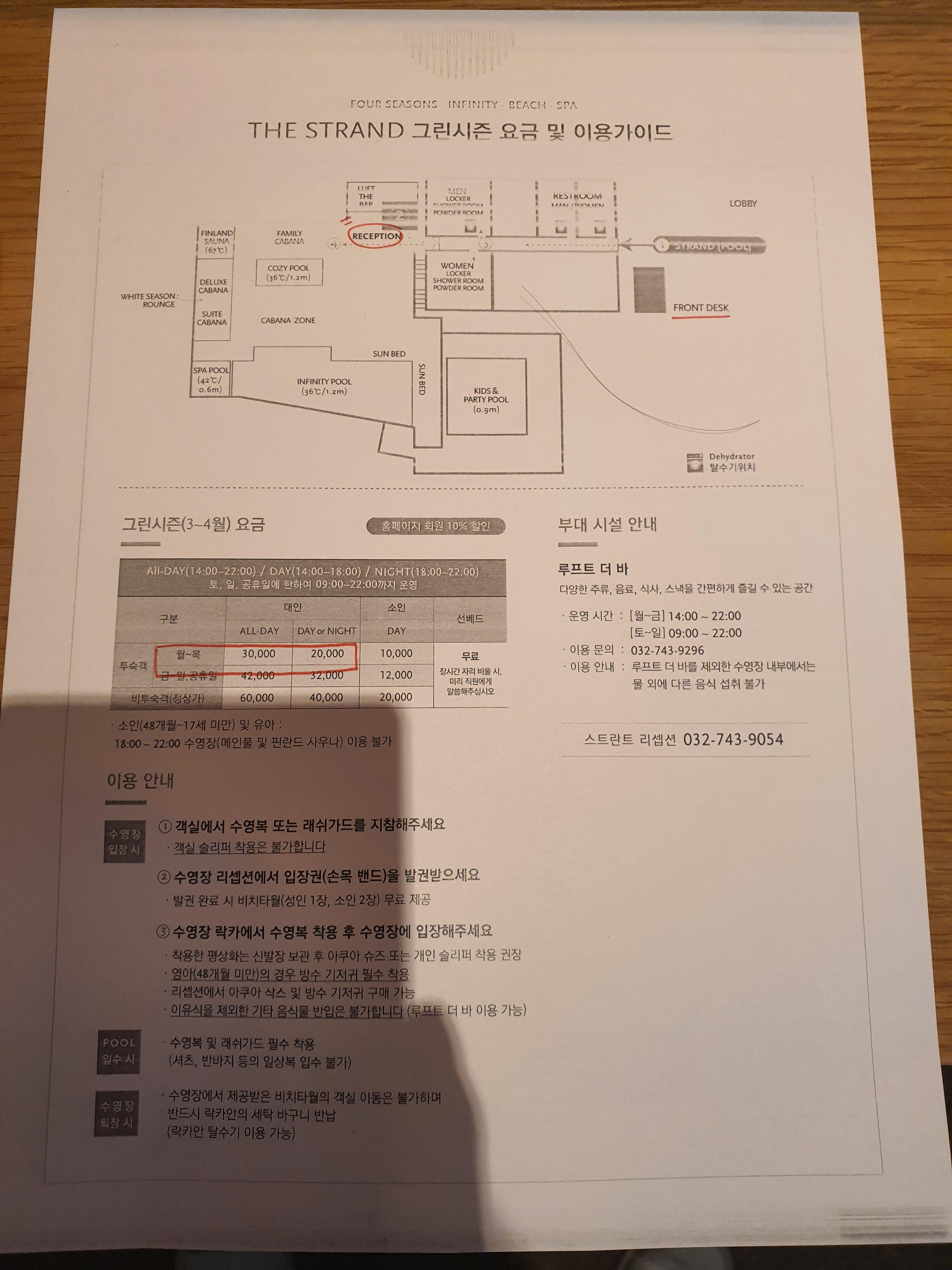 방에 다시 들어와서 조금 쉬다가 수영장을 내려가 볼 예정입니다. 시즌별로 가격이 다른 모양입니다. 참고하시면 좋겠네요.