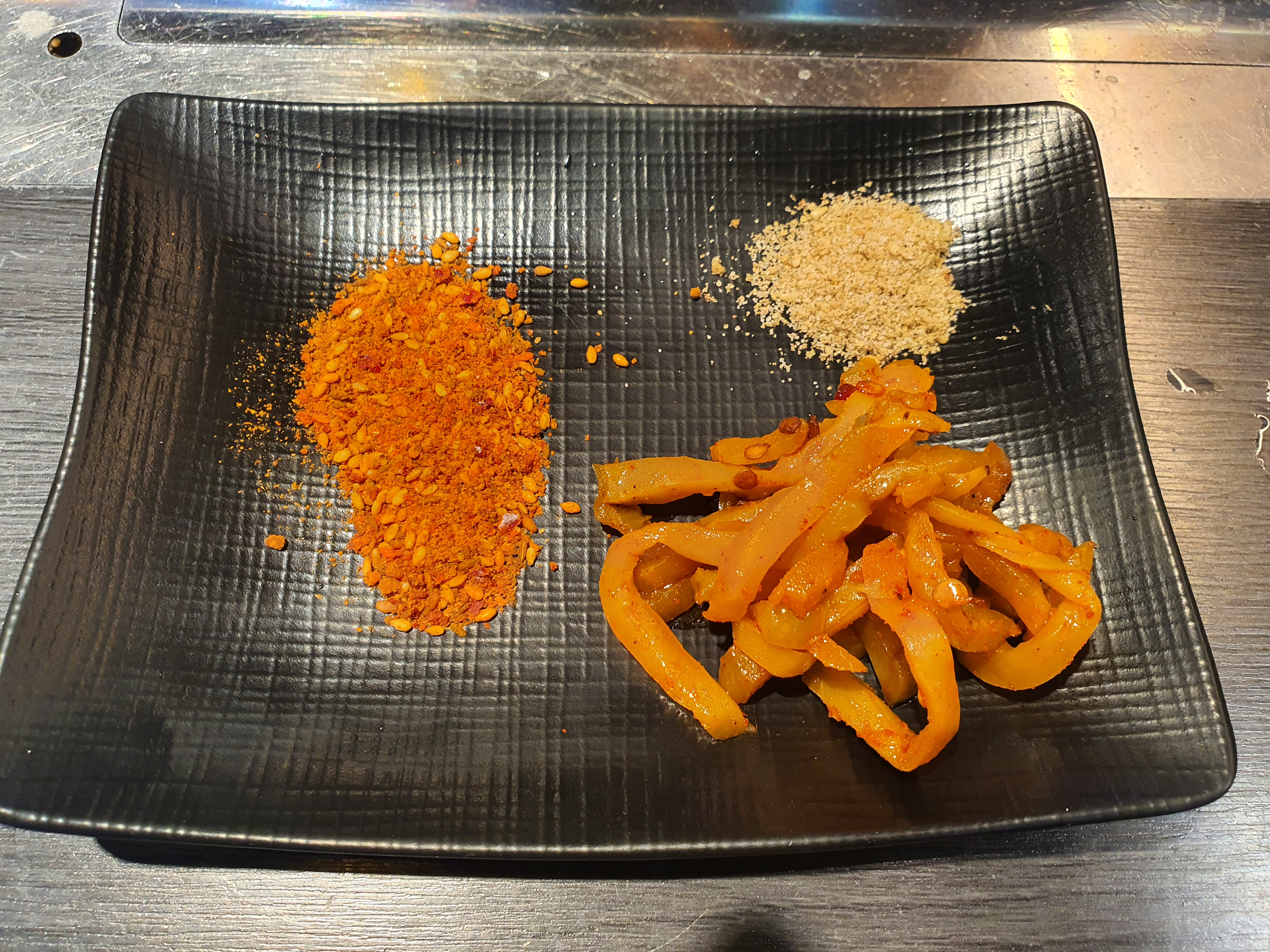 기본 찬이 나왔습니다. 원래 쯔란만 주는데 소금도 주시는 걸 보니 양고기구이용인 것 같습니다.
