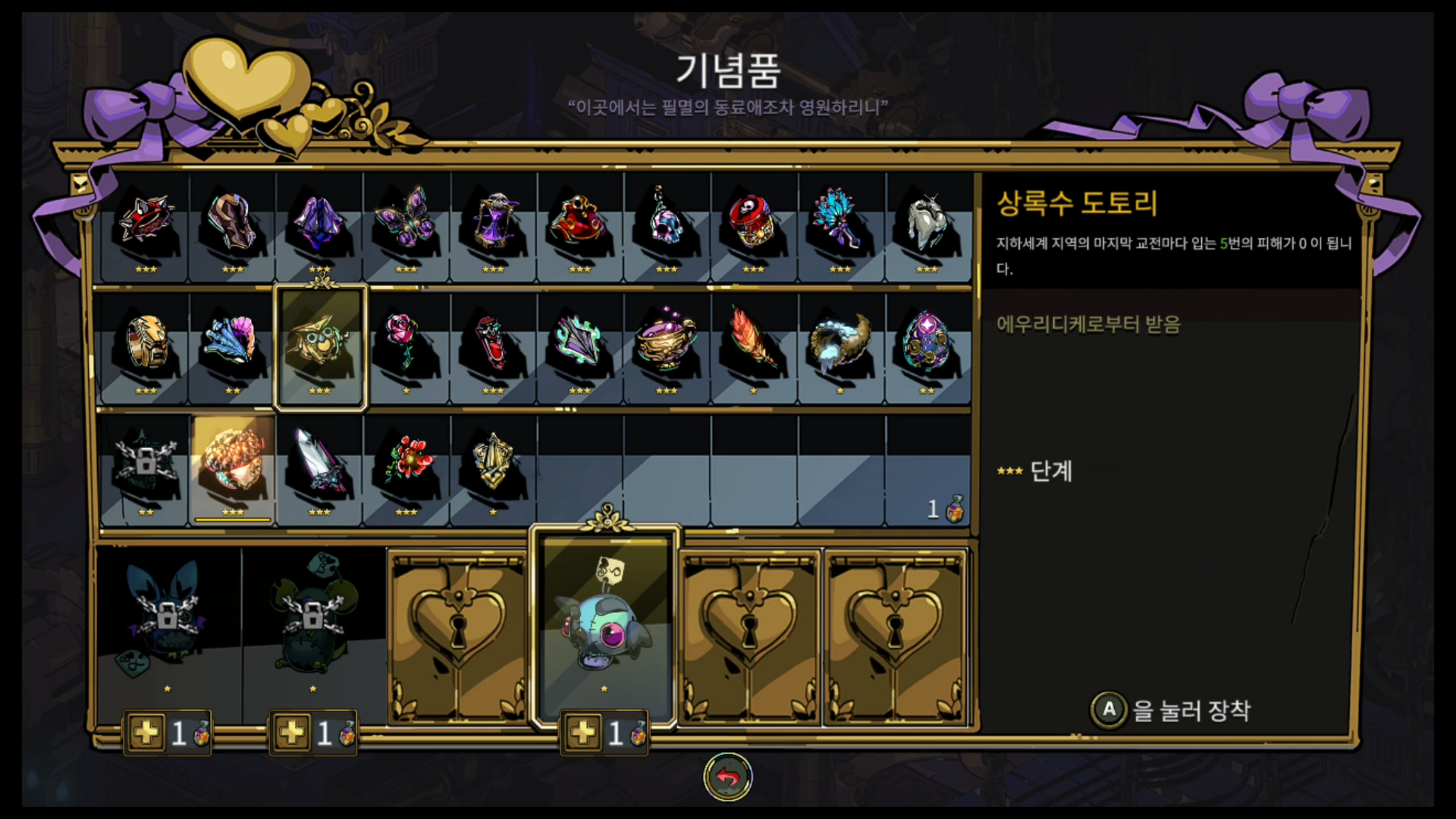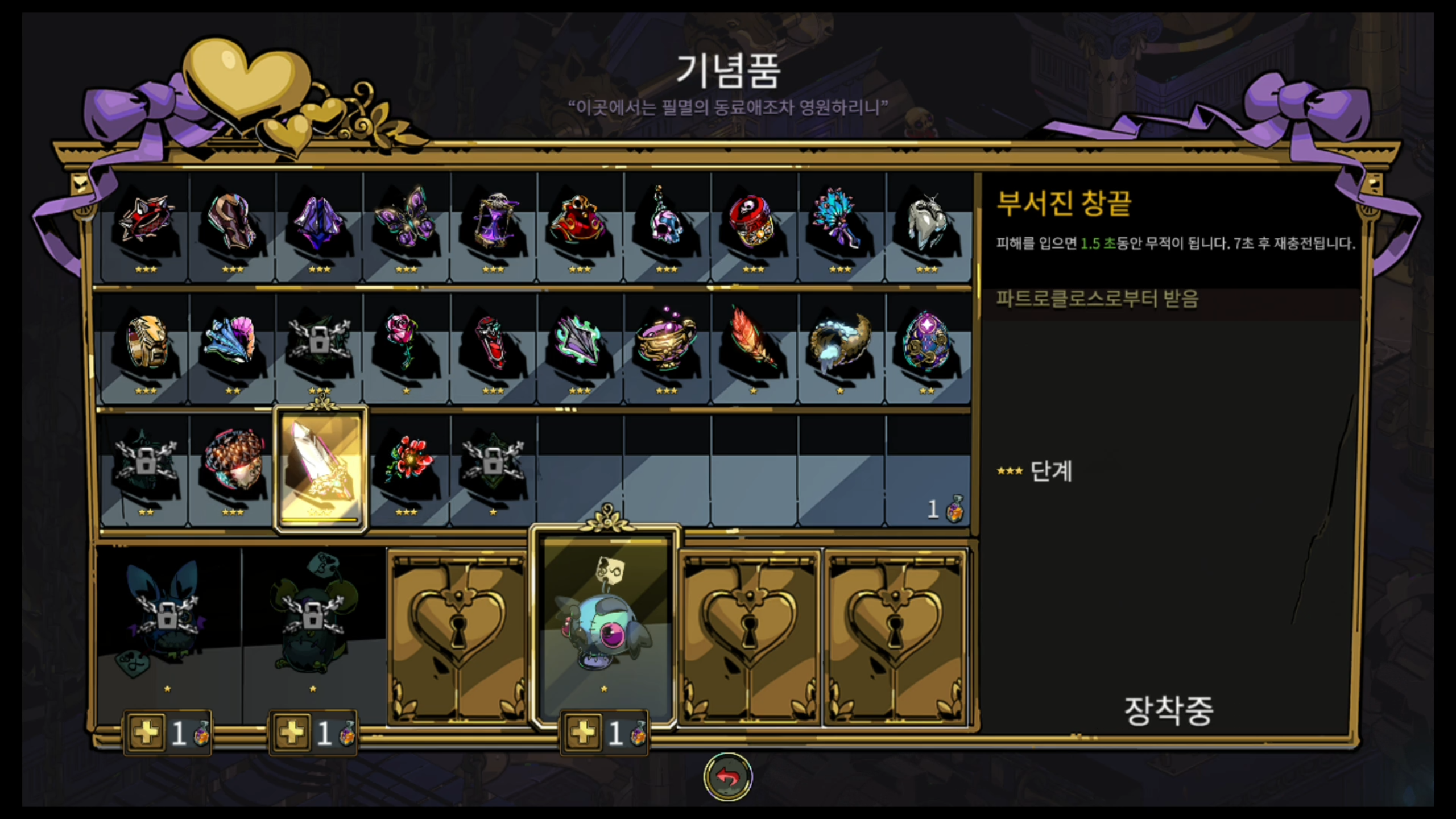 기념품 세팅입니다. 동료는 스켈리로 가고(아직 익숙지 않아서 그런가 잘 안 씁니다.) 기념품은 바스러진 족쇄로 일단 가보겠습니다. 단계도 올릴 겸요.