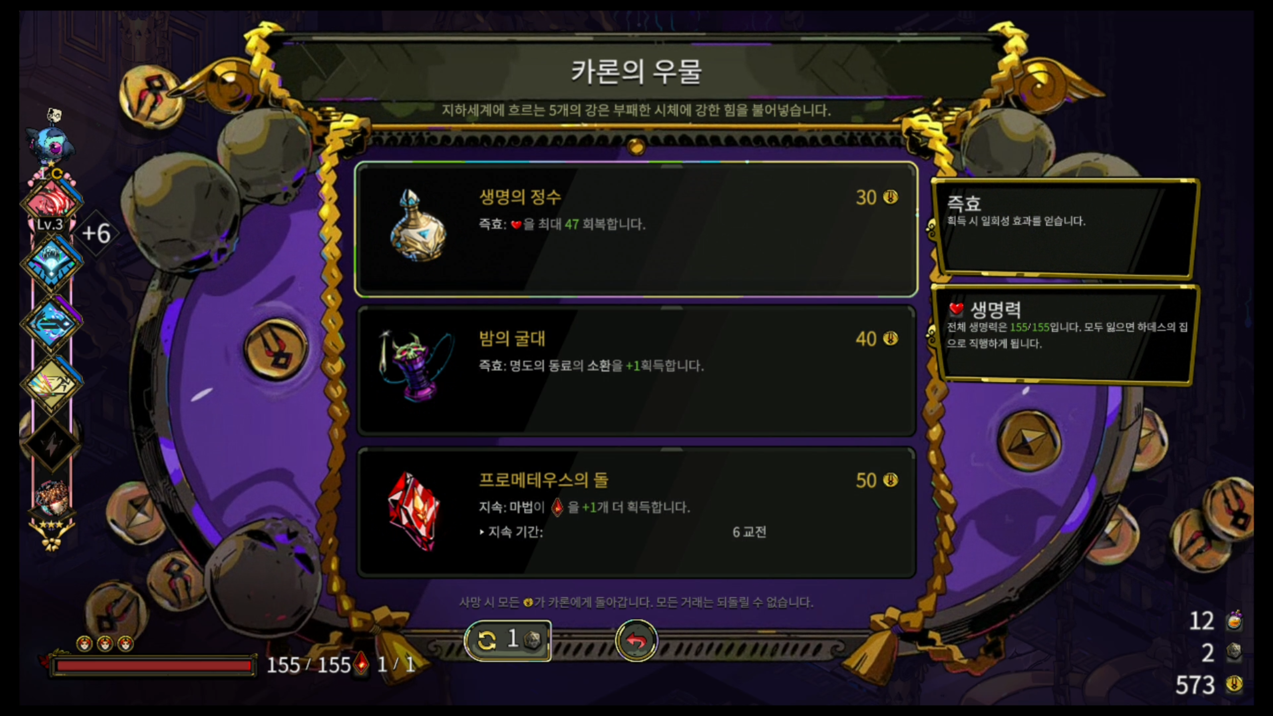 카론의 우물에서는 마침 생명의 정수를 판매하니 이걸 마시고 2 스테이지로 입장하겠습니다.