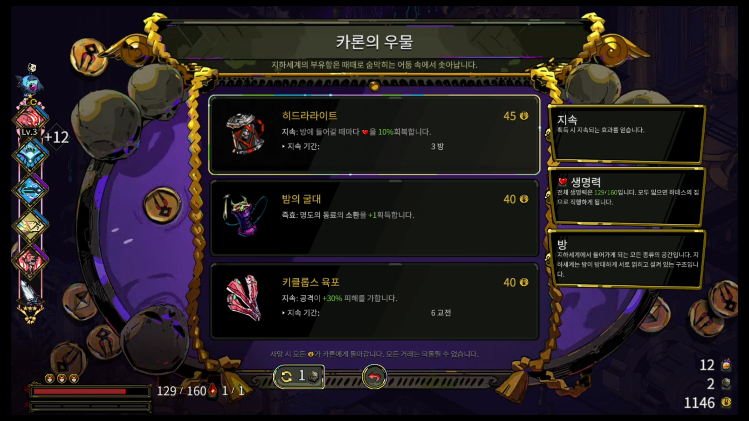 카론의 우물에서 딱히 구매할 만한 아이템은 안 보이네요. 아무것도 구매하지 않고 바로 올라가겠습니다.