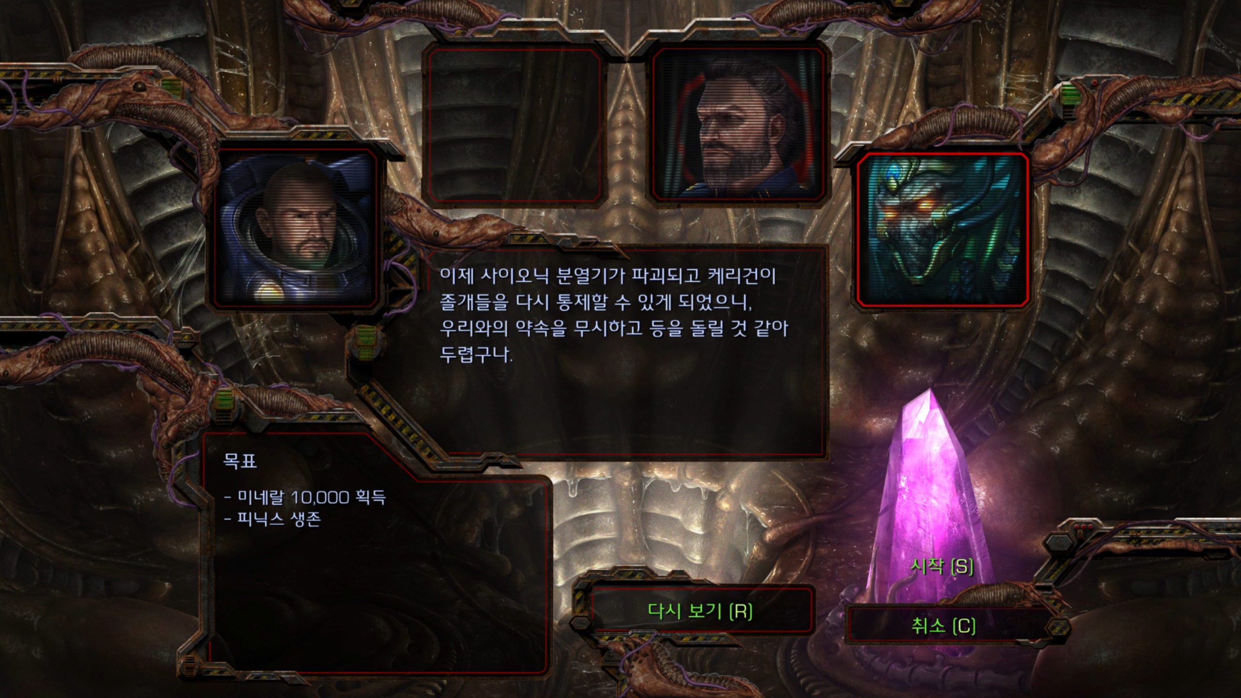 저번 미션에서 사이오닉 분열기를 성공적으로 파괴한 것에 대해 케리건의 배신을 걱정하는 피닉스.