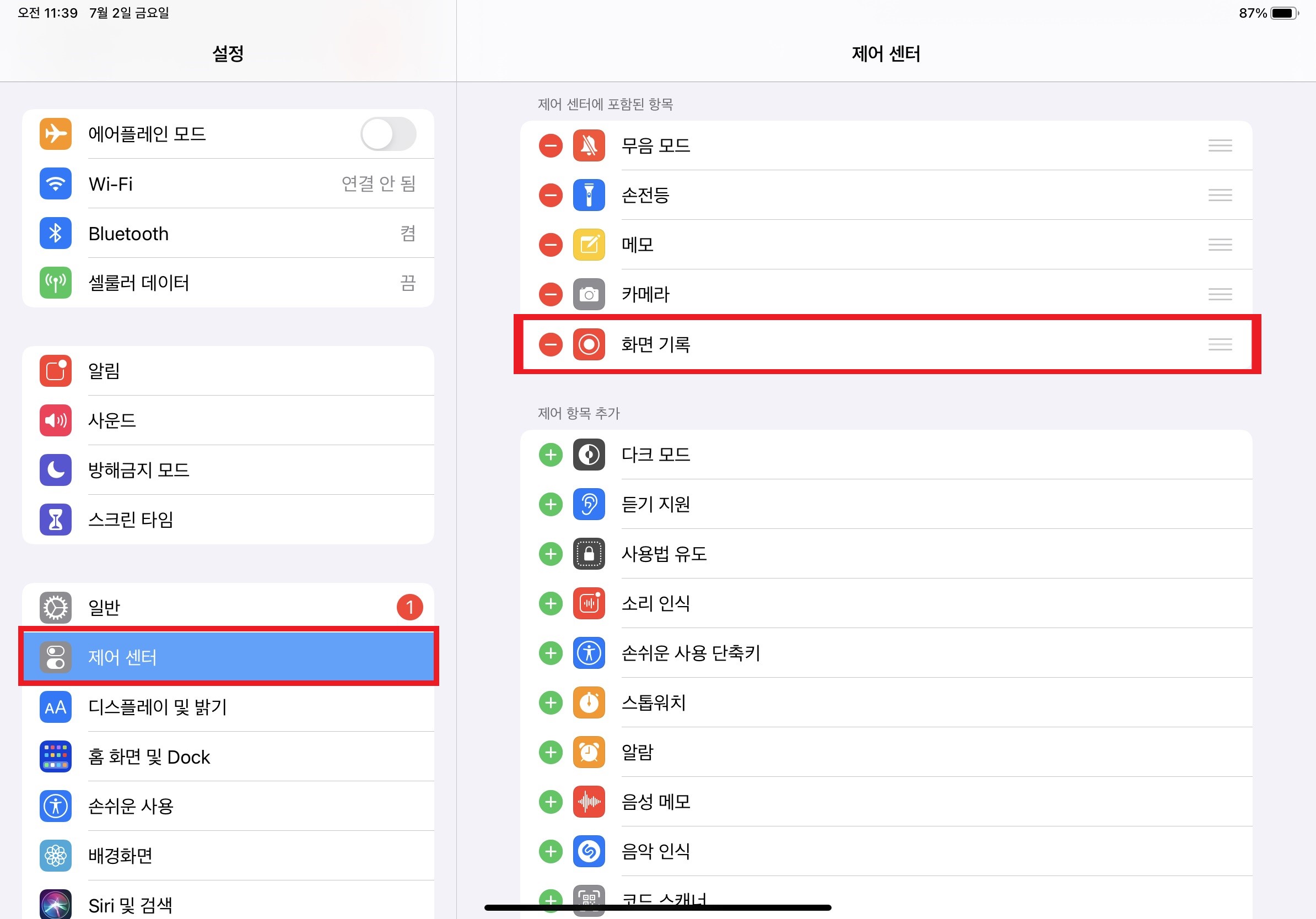 제어 센터에 포함된 항목에 화면 기록이 추가되면 성공입니다.