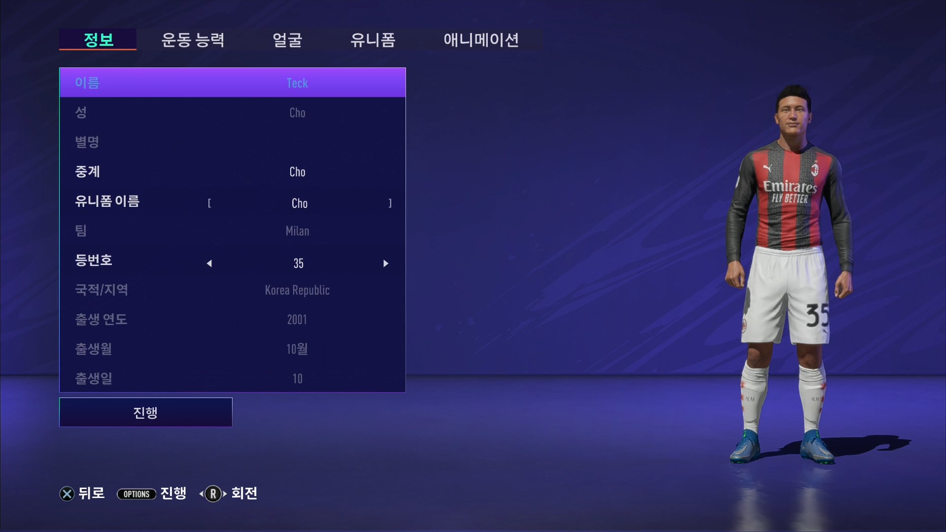 신규 선수는 카테고리가 5개(정보, 운동능력, 얼굴, 유니폼, 애니메이션)인 반면