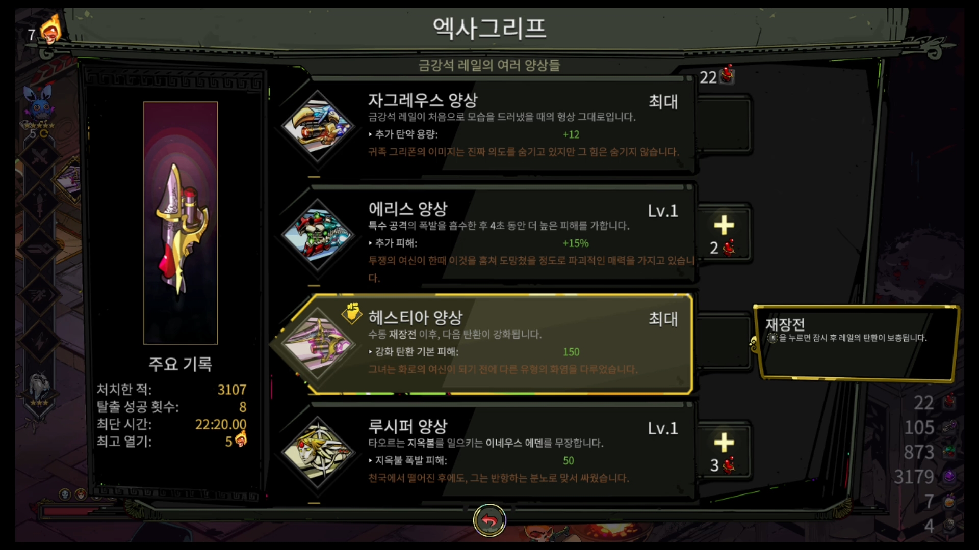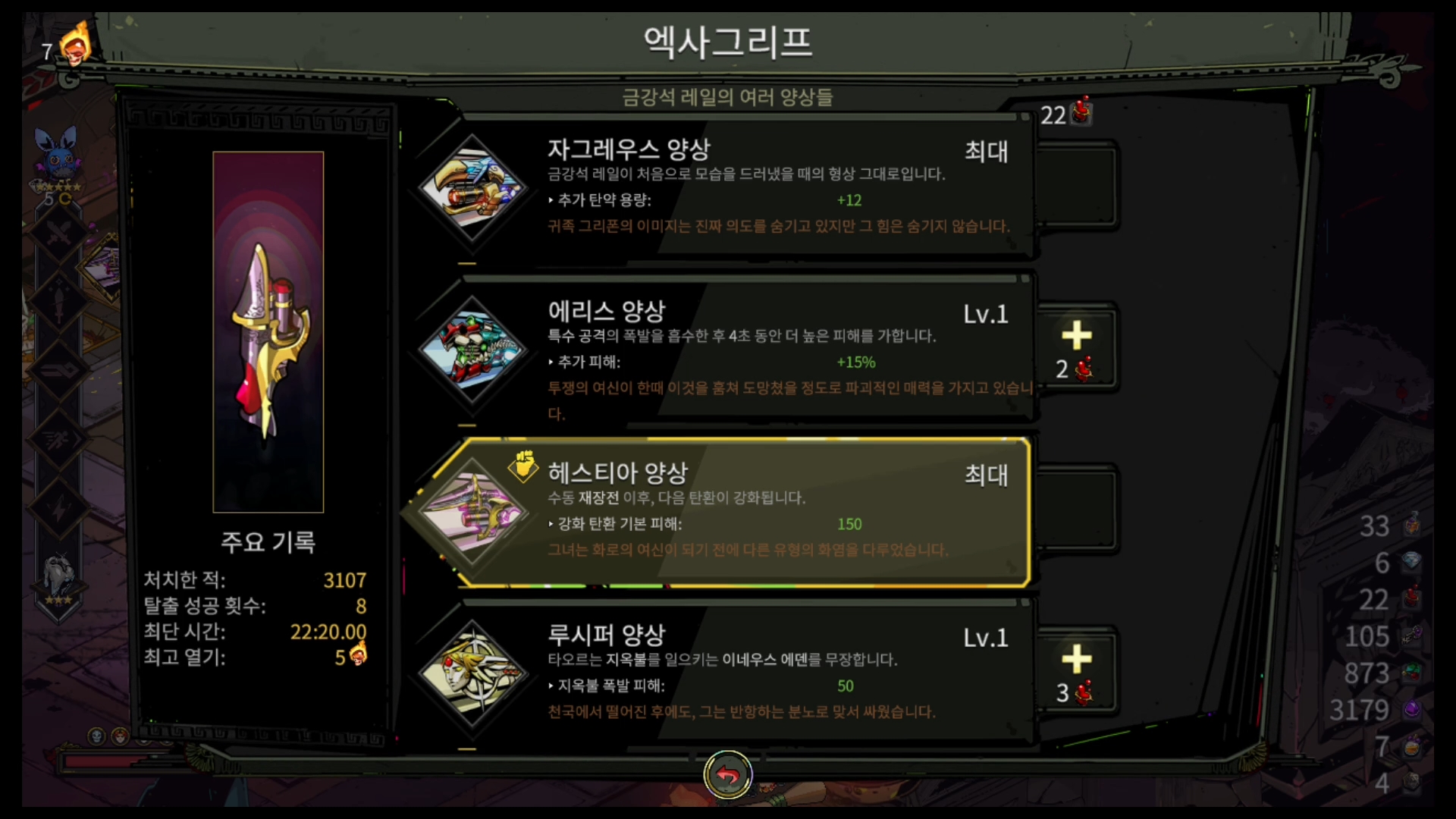 총 양상들은 역시나 네가지로, 기본형인 자그레우스 양상, 에리스, 헤스티아, 그리고 우리에게 친숙한 이름인 루시퍼 양상으로 구성되어 있습니다.