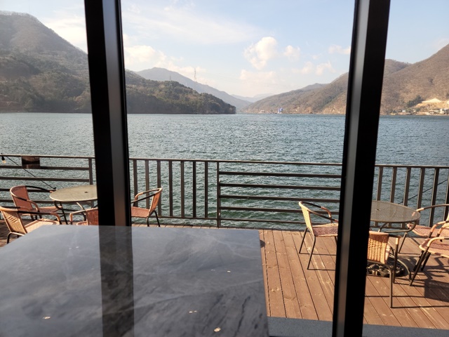 카페 내부 역시 카운터와 동일하게 통유리 구조로 산과 호수가 아주아주 잘 보입니다.