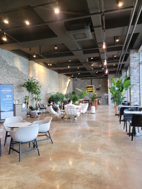 카페 내부는 긴 직사각형 형태로, 층고도 높고 길이도 길고 여유 공간도 많아서 개방감이 너무나 좋습니다.
