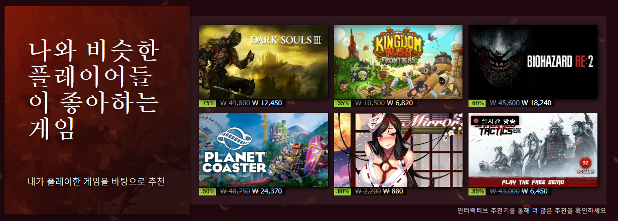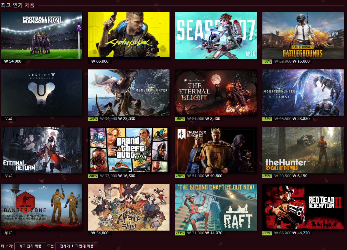밑에도 더 있는데 밑에는 신규 게임 및 내가 플레이한 게임 관련 할인 목록들이 쭉 나옵니다.