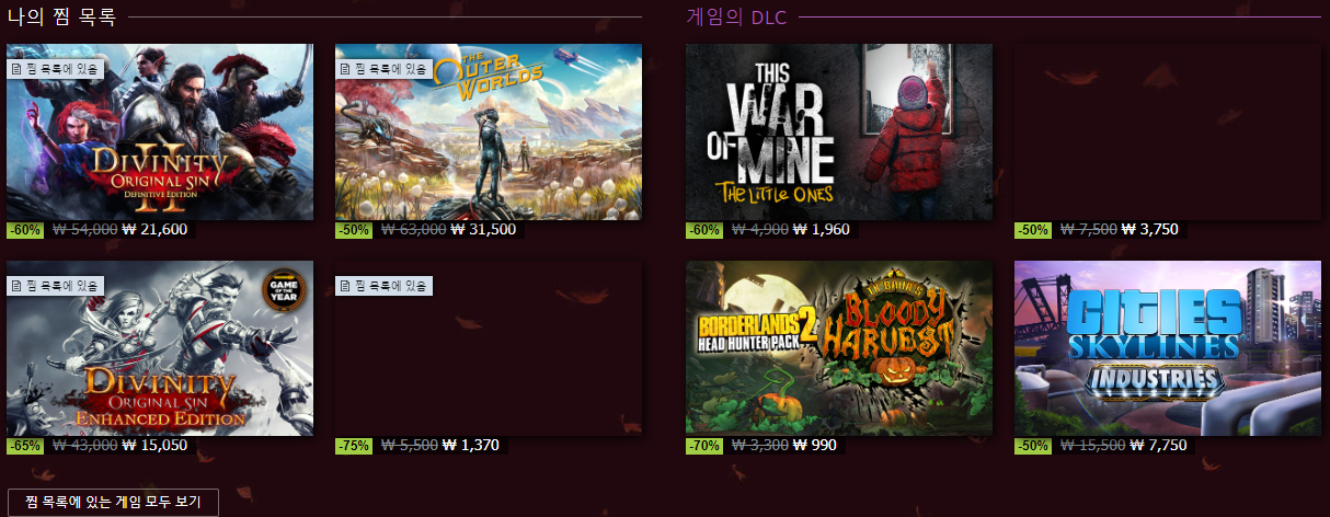찜 목록에 있는 게임 중 할인 중인 컨텐츠를 표시해 주기도 하네요. 이건 굉장히 마음에 드네요.
