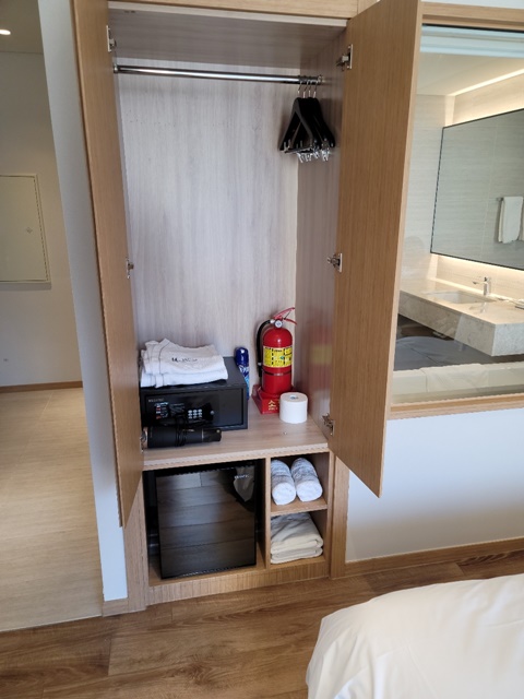 아래쪽에는 여분의 수건과 냉장고가 있는데 냉장고 크기가 많이 작은 편입니다.