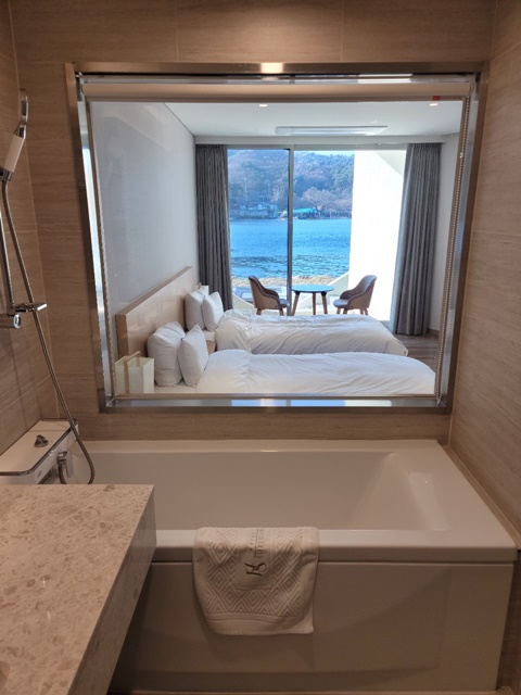 다만 연인이 아닌 사람들이 투숙할 경우는 상당히 민망할 수도 있는데 그럴 경우를 대비해서 블라인드가 달려 있어서 필요할 때 열고 가리고 할 수 있는 부분도 아주 훌륭합니다.