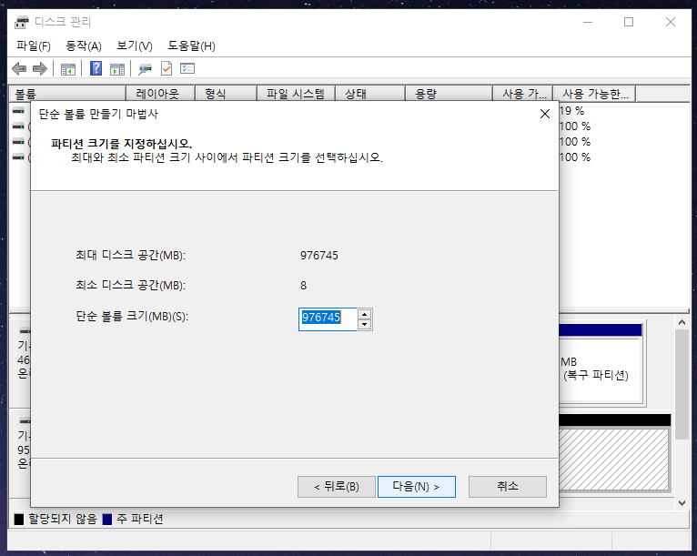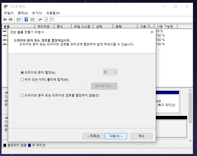 이 할당되지 않음을 할당시켜서 검정색 막대그래프를 디스크 0처럼 파란색으로 바꿔주면 해당 드라이버를 사용하실 수 있다고 생각하시면 됩니다.