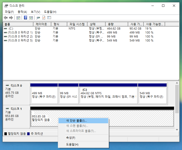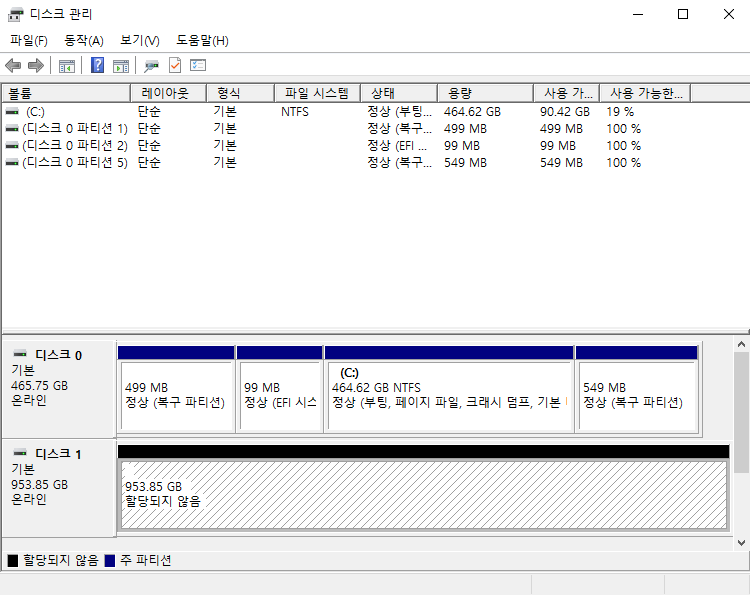 창 아래에 보시면 기존 SSD는 디스크 0으로 표시되어 있고 신규 SSD도 디스크 1로 보여지는데 현재 할당되지 않은 상태라고 나옵니다.