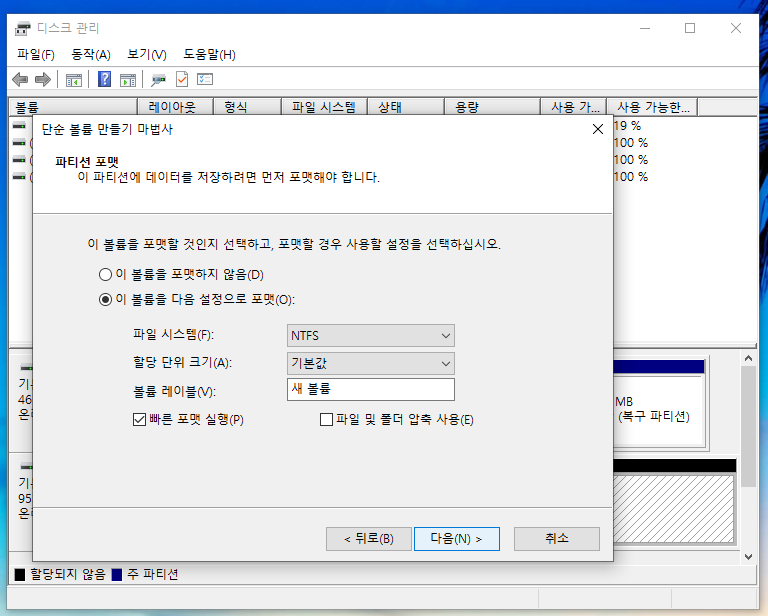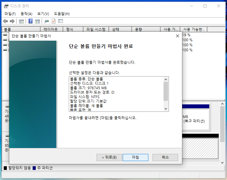 포맷이 끝나면 드디어 볼륨 만들기 마법사가 완료되었습니다.