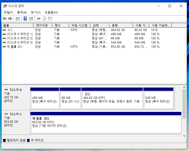 왼쪽이 기존의 C드라이브, 오른쪽이 신규 설치한 D드라이브입니다.