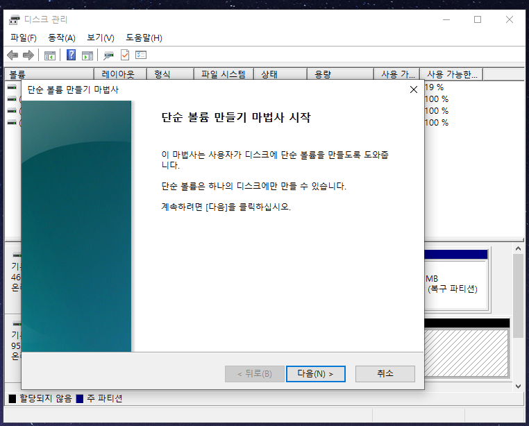 그러면 사진처럼 단순 볼륨 만들기 마법사 시작이라는 새 창이 뜨는데요.