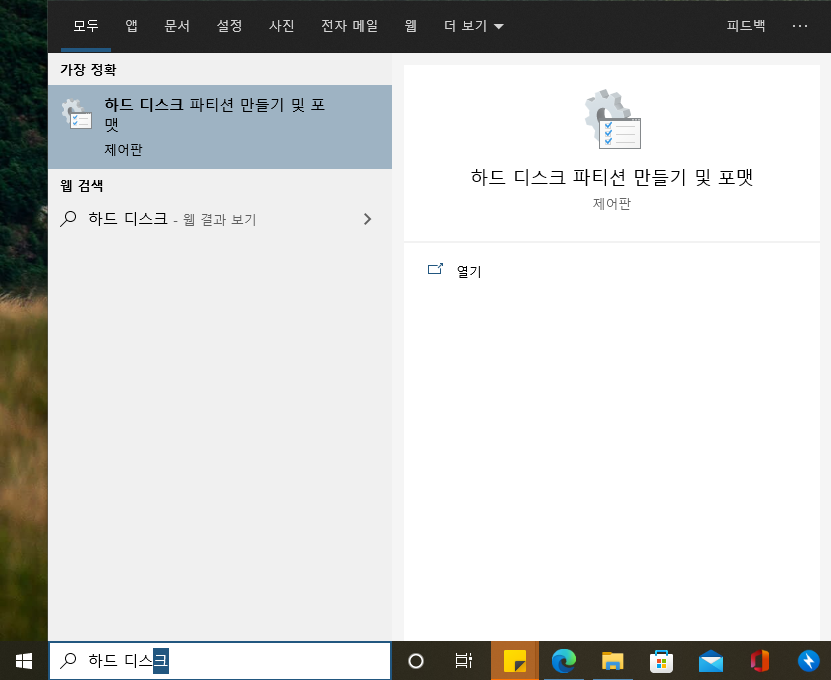 우선 바탕화면 검색창을 이용하여 제어판 내에 있는 하드 디스크 파티션 만들기 및 포맷이라는 기능을 실행해 줍니다.