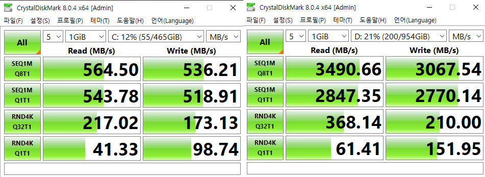 특히 첫 번째 항목과 두 번째 항목, SEQ1MQ8T1(순차 동시 읽기/쓰기), SEQ1MQ1T1(순차 단일 읽기/쓰기) 항목은 5~6배 정도의 속도 차이를 보여주죠.