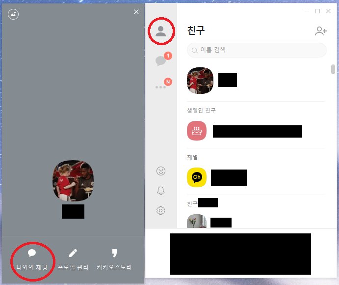 실행 후 보이는 왼쪽 위 인물 이모티콘을 클릭한 후 본인 프로필을 클릭하시면 나와의 채팅 기능을 이용할 수 있습니다.
