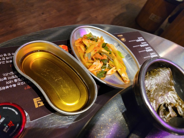 이 반합통 같이 생긴 기름장에다가는 같이 온 파김치와 마늘을 넣어서 구워주시는데 이게 또 맛이 괜찮은 편입니다.