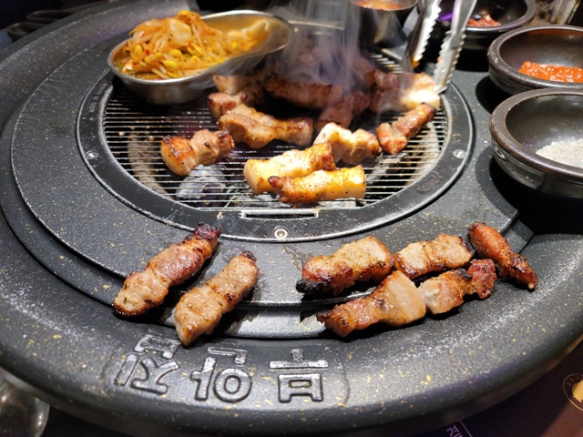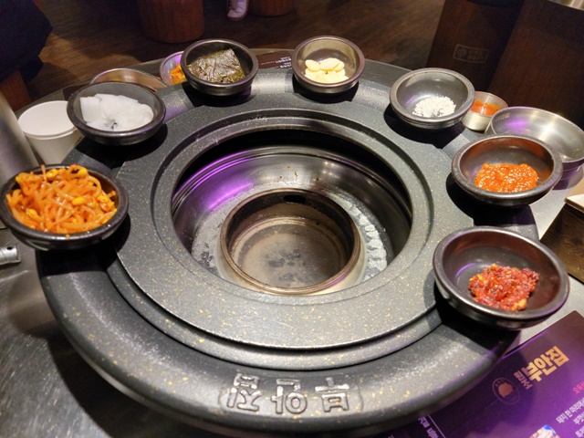 고기가 다 익으면 불판 옆으로 옮겨서 먹으면 되는데 보시면 아시겠지만 불판이 특이한 편입니다.