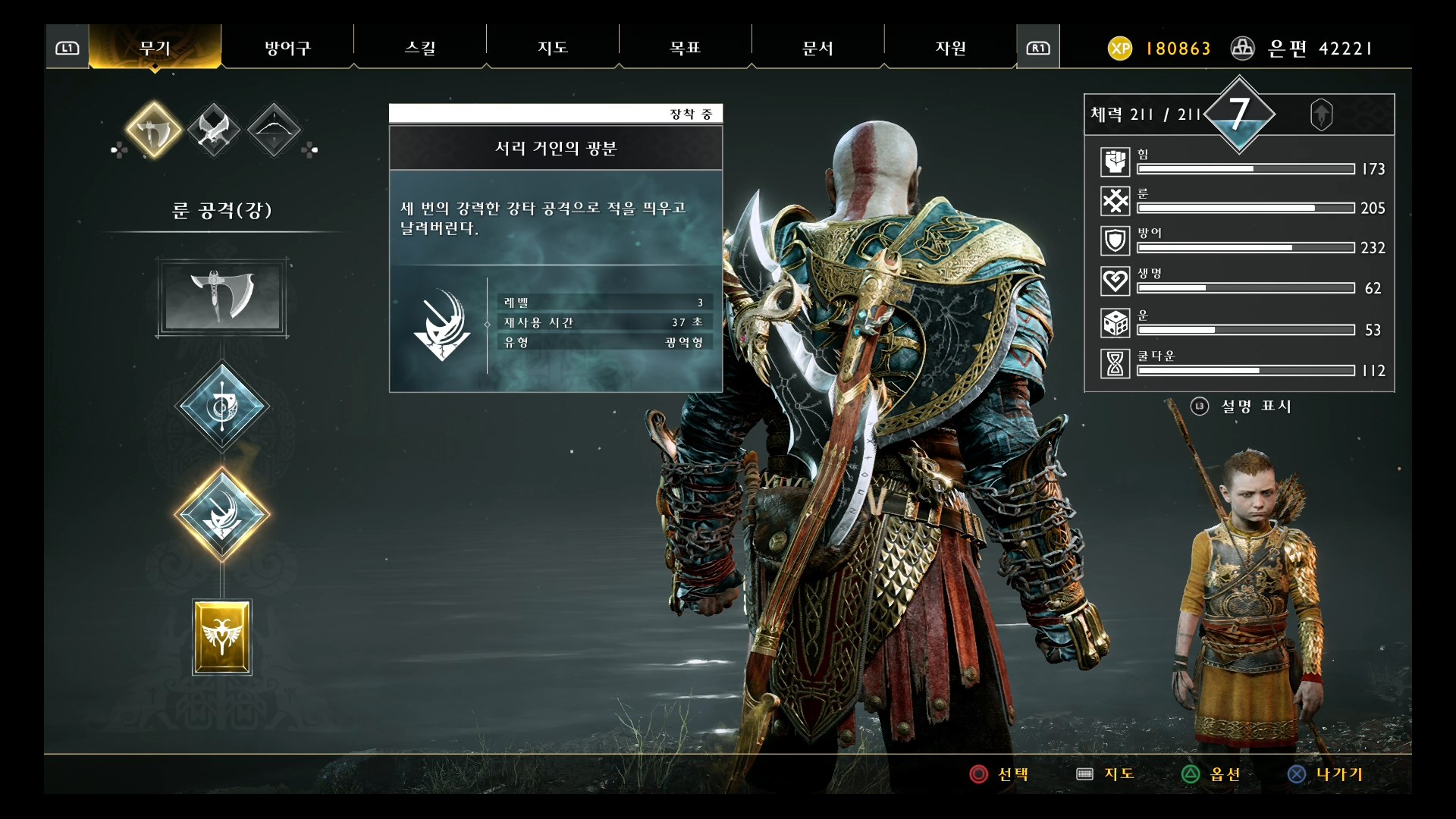 도끼 자루는 발키리 아이템인 추락한 자의 날개를 장비한 상태입니다.