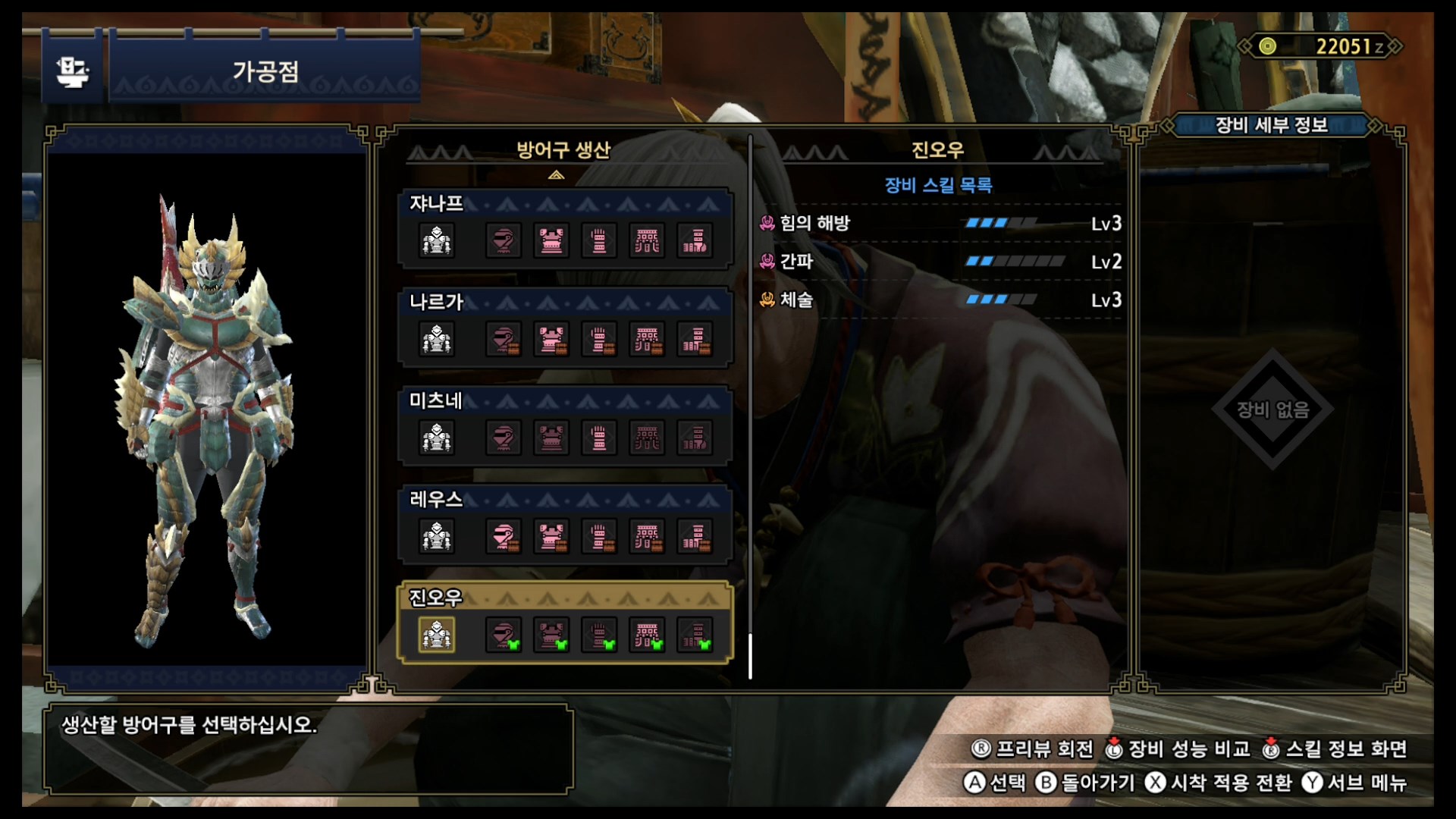 마지막 방어구는 진오우거 소재로 제작 가능한 진오우 세트입니다.