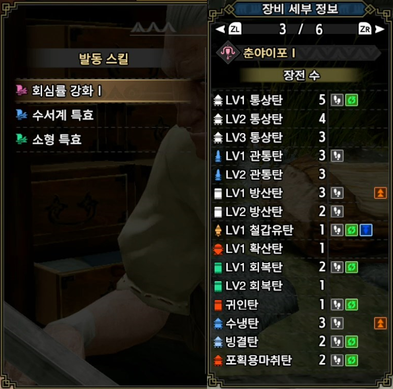 무기 중에서는 가장 다양한 속성탄을 사용할 수 있다는 점에서 자주 사용하지 않을까 싶은 무기입니다.