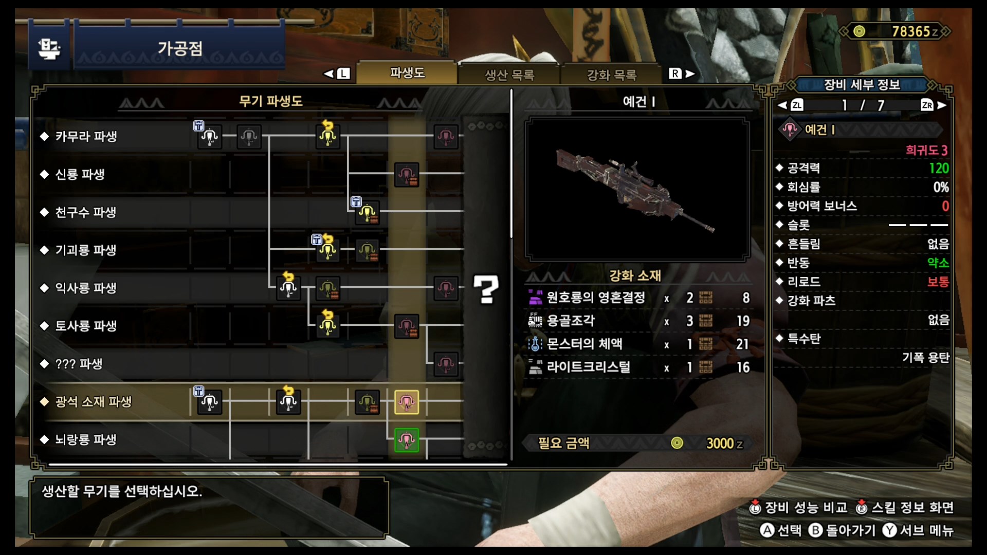 세 번째 무기는 광석 소재 파생 무기인 예건 I입니다.