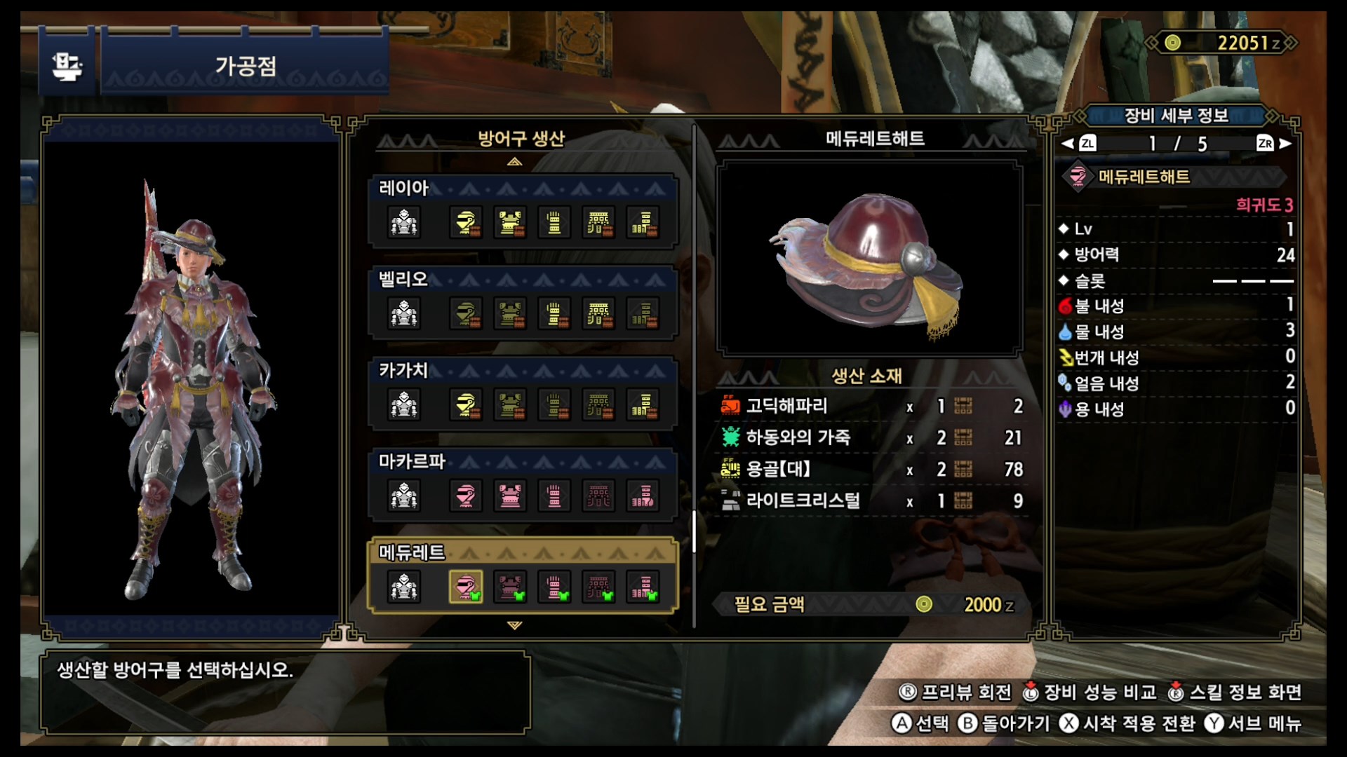 이번에 제작한 방어구 중 순수 방어력은 좀 떨어지는 편이나 무난한 스킬들과 물 내성이 좋아서 제작해 보았습니다.