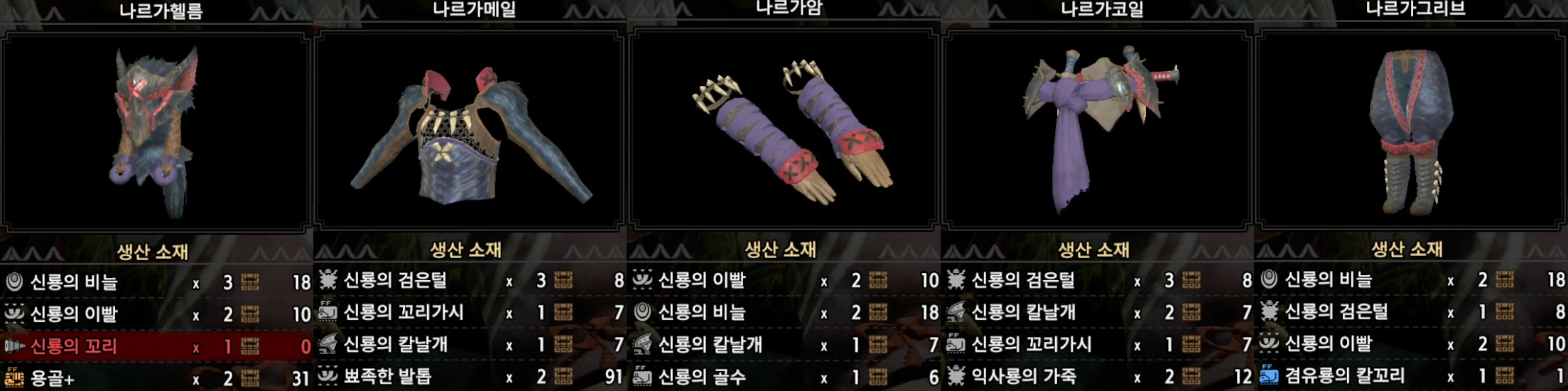 일단 수치상으로만 보면 좋은 장비들은 꽤 많이 만들 수가 있었습니다만, 제가 최종적으로 고른 장비는 나르가 세트입니다.