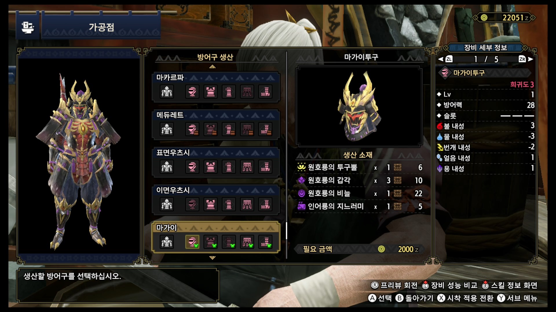 무기와 마찬가지로 방어구 세트에도 원호룡의 검갑각이 많이 들어가는 편이니 마가이마가도 소재를 구할 때는 꼭 등 부위를 반드시 파괴한다는 생각으로 사냥을 진행해 주시면 되겠습니다.