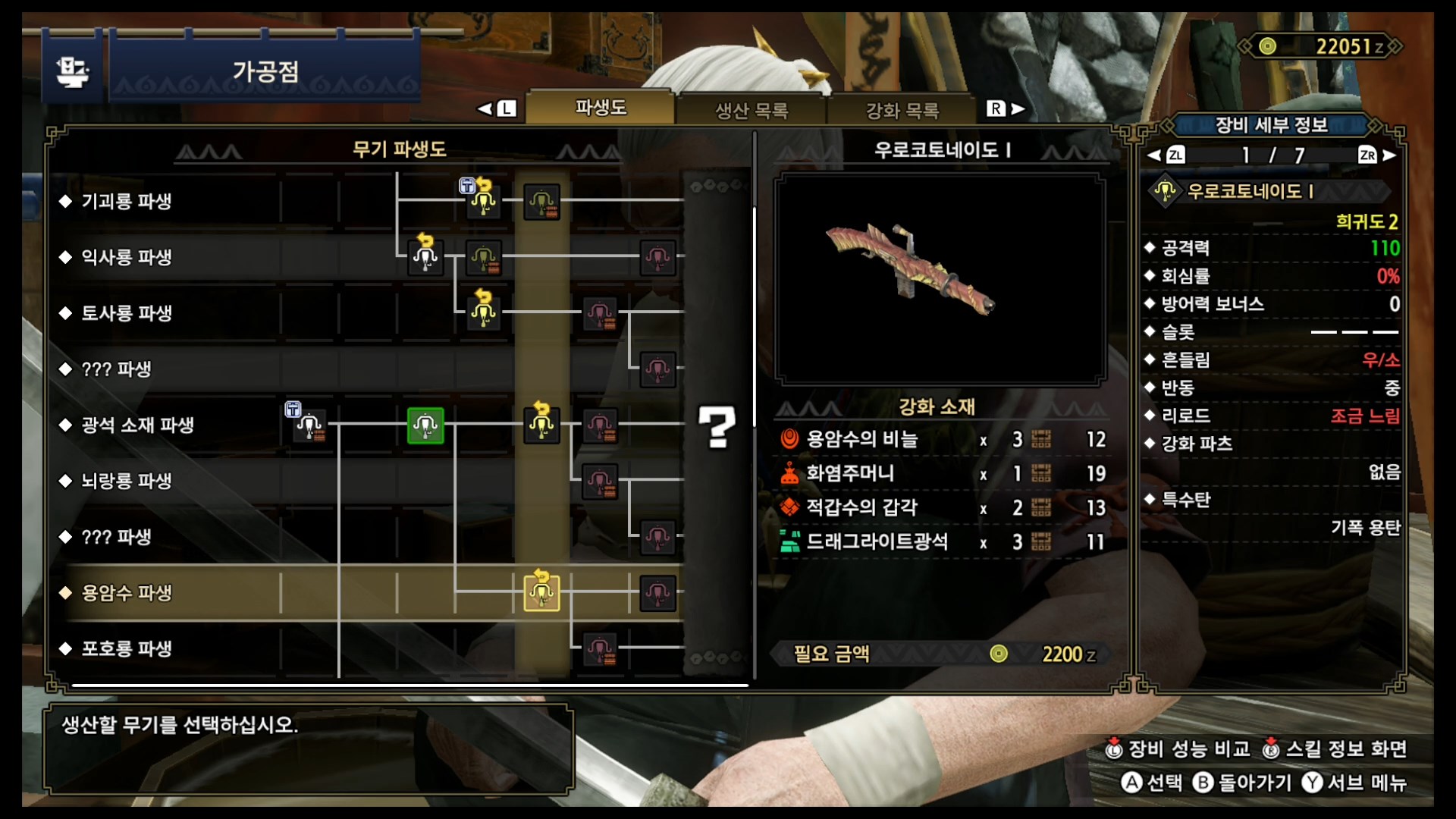 사실 이 전 단계에서 나왔어야 하는 무기이지만, 우로코트르를 한 번도 사냥을 안 해서 그런 건지 이전 단계에서는 해금이 진행되지 않았습니다.